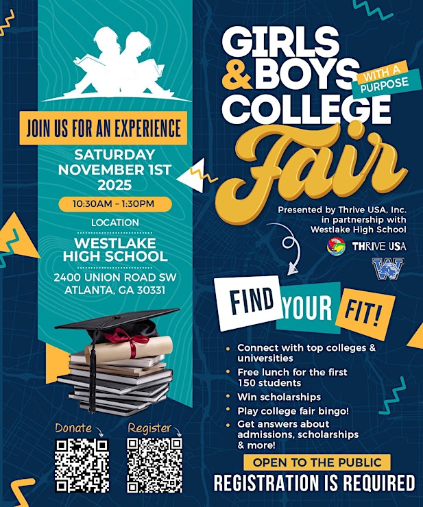 JOIN US FOR AN EXPERIENCE SATURDAY NOVEMBER 1ST 2025 10:30AM-1:30PM LOCATION: WESTLAKE HIGH SCHOOL 2400 UNION ROAD SW ATLANTA, GA 30331 Presented by Thrive USA, Inc. in partnership with Westlake High School THRIVE USA FIND YOUR FIT! Connect with top colleges & universities Free lunch for the first 150 students Win scholarships Play college fair […]