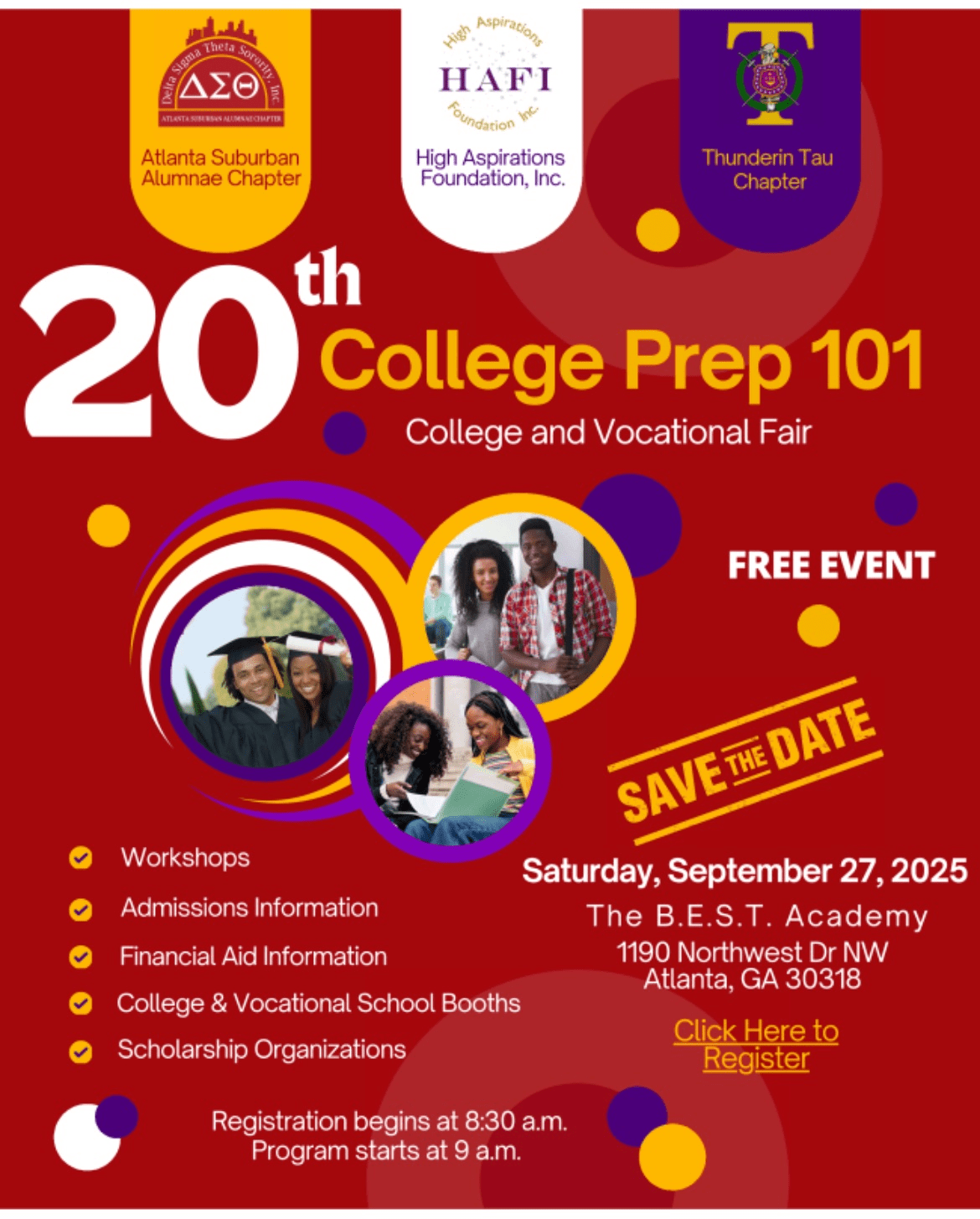 · September 27th College Prep 101 College and Vocational Fair: Event Details: Date: September 27, 2025 Time: Registration begins: 8:30 AM; Program begins: 9:00 AM Location: The B.E.S.T. Academy 1190 Northwest Dr, NW Atlanta, GA 30318 To sign-up as a college rep/vendor/attendee, please click HERE. If you have questions, please contact collegeprep@asacdst.org.
